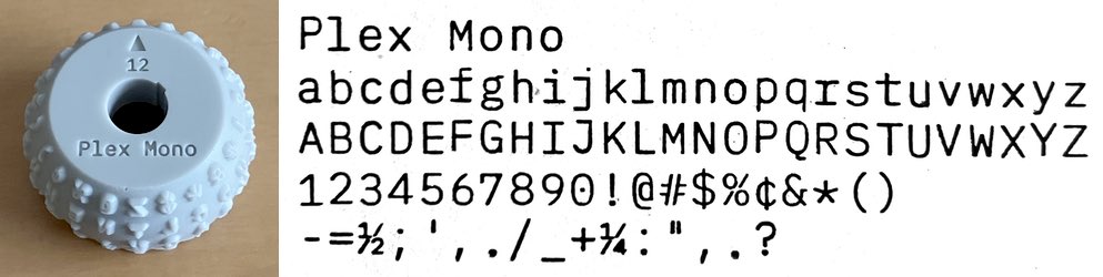 Plex Mono is the fixed width version of IBM's official typeface. I wasn't too keen on it until I read that the italic version was heavily influenced by the Selectric Light Italic typeface, which is one of my favorites. It's also just perfectly apt having IBM's new corporate font available on a Selectric. (Source)